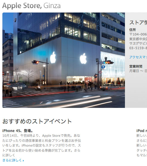 2011年10月5日午前1時ちょっとなのにhttp://www.apple.com/jp/retail/ginza/には「iPhone 4S、登場。」と開示されているので、もうわかったから詳細は朝のお楽しみ。。