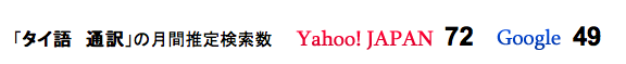 月間推定検索数を調べて、説明する例として、「タイ語+通訳」と「タイ語+翻訳」の検索数を見てみると、「タイ語」に関連した通訳と翻訳とではこんなにも差があった。