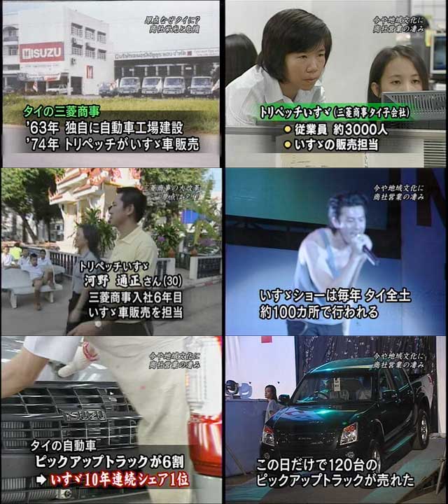 新・日記のある暮らし トリペッチいすゞのいすゞショー:タイ全土 by • 2007年9月30日 • 0 Comments パナダ・チェナバシン(トリペッチいすゞ:宣伝担当役員)さんが、考えたいすゞショー。日本語もぺらぺらですが、トリペッチいすゞの河野通正さんのタイ語もすばらしいですね。 (テレビ朝日のサンデープロジェクトより) More from my blog稼働中の携帯電話(日タイ編):2025/01/12ガード下に掲げられた手塚治虫壁画タイ航空の機内食に感動・・一度は飲んでいただきたい:Leica D-LUX5望遠向きかも知れないコンデジ:Leica D-LUX5スターバックスコーヒー店内の壁Leica D-LUX5 で望遠側90mmフォーカスもよいよい:Leica D-LUX5