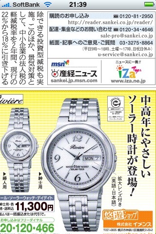 広告もこんな感じでちゃんと見られる。一応、すこしでも宣伝してさしあげようと購読お申し込み番号がくっきりの画面。やっぱり新聞は読みたいですよね。毎朝5時に配信されて、出勤してほかの新聞を読む前にも産経新聞がすでに読まれているという状態ですね。